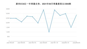 2022年3月,蔚来EC6销量为2857辆,同比增长15.02%,环比增长91.87%。2021年03月-2022年03月份,蔚来EC6销量为32311辆,同比增长164.82%。