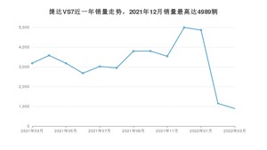 2022年3月,捷达VS7销量为889辆,同比下降72.04%,环比下降22.49%。2021年03月-2022年03月份,捷达VS7销量为41587辆,同比增长1.89%。