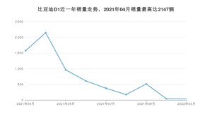2022年3月,比亚迪D1销量为39辆,同比下降97.52%,环比下降7.14%。2021年03月-2022年03月份,比亚迪D1销量为6437辆,同比增长59.25%。