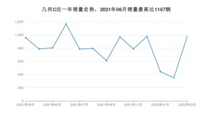 2022年3月,几何C销量为983辆,同比增长2.5%,环比增长180.86%。2021年03月-2022年03月份,几何C销量为10423辆,同比增长71.01%。