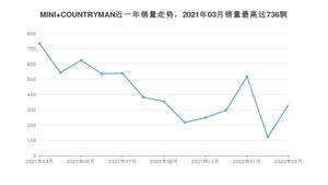 2022年3月,MINI COUNTRYMAN销量为332辆,同比下降54.89%,环比增长174.38%。2021年03月-2022年03月份,MINI COUNTRYMAN销量为5455辆,同比增长57.39%。