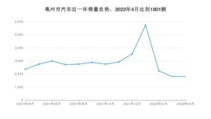 2022年4月,亳州市汽车总销量为1801辆,同比下降23.56%,环比持平。2021年04月-2022年04月份,亳州市总销量为37190辆,同比下降3.27%。在最近1年中,亳州市销量在2022年01月达到最高,销量为5733辆。