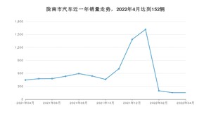 2022年4月,陇南市汽车总销量为152辆,同比下降65.84%,环比持平。2021年04月-2022年04月份,陇南市总销量为7721辆,同比下降19.23%。在最近1年中,陇南市销量在2022年01月达到最高,销量为1616辆。