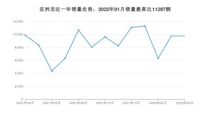2022年4月,亚洲龙销量为9768辆,同比下降1.1%,环比持平。2021年04月-2022年04月份,亚洲龙销量为113738辆,同比下降19.6%。