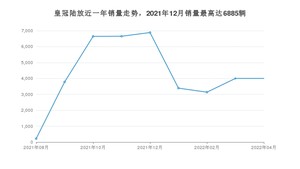 2022年4月,皇冠陆放销量为4001辆,环比持平。2021年04月-2022年04月份,皇冠陆放销量为38716辆,