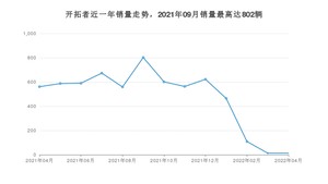 2022年4月,开拓者销量为13辆,同比下降97.68%,环比持平。2021年04月-2022年04月份,开拓者销量为6157辆,同比下降16.56%。