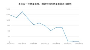 2022年4月,嘉际销量为34辆,同比下降97.67%,环比持平。2021年04月-2022年04月份,嘉际销量为10968辆,同比下降62.92%。