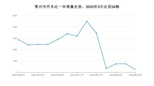2022年5月,鄂州市汽车总销量为24辆,同比下降91.64%,环比下降68%。2021年05月-2022年05月份,鄂州市总销量为2973辆,同比下降33.48%。在最近1年中,鄂州市销量在2021年12月达到最高,销量为451辆。