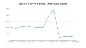 2022年5月,武威市汽车总销量为260辆,同比下降75.29%,环比下降17.72%。2021年05月-2022年05月份,武威市总销量为12726辆,同比下降23.92%。在最近1年中,武威市销量在2022年01月达到最高,销量为2401辆。