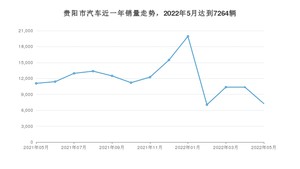 2022年5月,贵阳市汽车总销量为7264辆,同比下降34.44%,环比下降29.92%。2021年05月-2022年05月份,贵阳市总销量为155241辆,同比下降8.06%。在最近1年中,贵阳市销量在2022年01月达到最高,销量为19947辆。