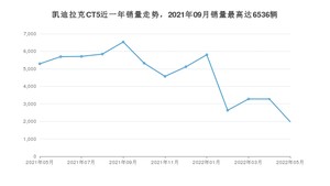 2022年5月,凯迪拉克CT5销量为1977辆,同比下降62.63%,环比下降39.67%。2021年05月-2022年05月份,凯迪拉克CT5销量为61050辆,同比增长0.1%。