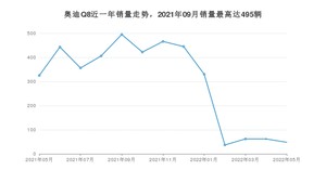 2022年5月,奥迪Q8销量为48辆,同比下降85.23%,环比下降22.58%。2021年05月-2022年05月份,奥迪Q8销量为3897辆,同比下降38.51%。