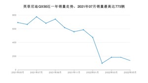 2022年5月,英菲尼迪QX50销量为135辆,同比下降80.46%,环比下降26.23%。2021年05月-2022年05月份,英菲尼迪QX50销量为6383辆,同比下降61.92%。
