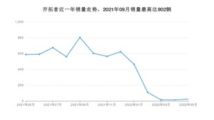 2022年5月,开拓者销量为22辆,同比下降96.25%,环比增长69.23%。2021年05月-2022年05月份,开拓者销量为5618辆,同比下降26.32%。