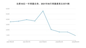 2022年5月,远景X6销量为898辆,同比下降74.48%,环比下降43.66%。2021年05月-2022年05月份,远景X6销量为26464辆,同比下降69.6%。