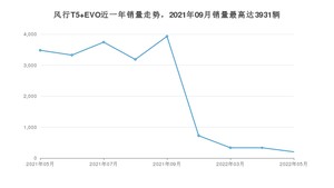 2022年5月,风行T5 EVO销量为201辆,同比下降94.22%,环比下降39.82%。2021年05月-2022年05月份,风行T5 EVO销量为19255辆,同比下降2.23%。