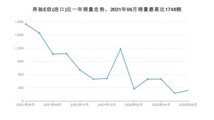 2022年6月,奔驰E级(进口)销量为240辆,同比下降86.27%,环比增长38.73%。2021年06月-2022年06月份,奔驰E级(进口)销量为10005辆,同比下降28.91%。