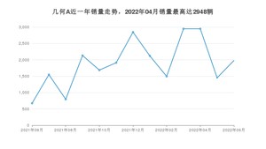 2022年6月,几何A销量为1979辆,同比增长194.06%,环比增长36.39%。2021年06月-2022年06月份,几何A销量为24532辆,同比增长301.24%。