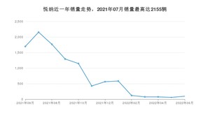 2022年6月,悦纳销量为96辆,同比下降94.34%,环比增长62.71%。2021年06月-2022年06月份,悦纳销量为10058辆,同比下降60.76%。