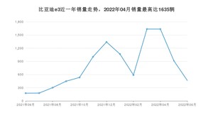 2022年6月,比亚迪e3销量为464辆,同比增长163.64%,环比下降49.23%。2021年06月-2022年06月份,比亚迪e3销量为10286辆,同比增长66.68%。