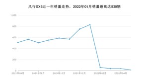 2022年6月,风行SX6销量为13辆,同比下降97.45%,2021年06月-2022年06月份,风行SX6销量为5012辆,同比下降43.23%。