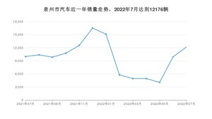 2022年7月,泉州市汽车总销量为12176辆,同比增长21.87%,环比增长22.74%。2021年07月-2022年07月份,泉州市总销量为126948辆,同比下降14.7%。在最近1年中,泉州市销量在2021年12月达到最高,销量为16519辆。