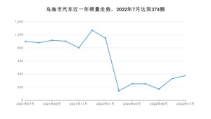 2022年7月,乌海市汽车总销量为374辆,同比下降58.31%,环比增长14.02%。2021年07月-2022年07月份,乌海市总销量为7916辆,同比下降32.38%。在最近1年中,乌海市销量在2021年12月达到最高,销量为1068辆。