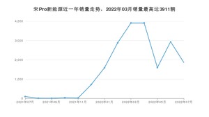 2022年7月,宋Pro新能源销量为1861辆,同比增长1%,环比下降36.72%。2021年07月-2022年07月份,宋Pro新能源销量为19583辆,同比增长104.33%。