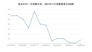 2022年7月,奥迪A7销量为78辆,同比下降86.36%,环比增长550%。2021年07月-2022年07月份,奥迪A7销量为3800辆,同比下降53.05%。