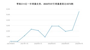 2022年7月,零跑C11销量为5572辆,环比增长155.83%。2021年07月-2022年07月份,零跑C11销量为22265辆,