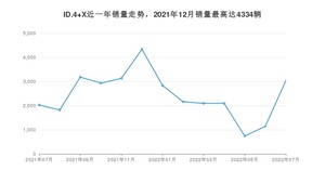 2022年7月,ID.4 X销量为3033辆,同比增长49.78%,环比增长166.05%。2021年07月-2022年07月份,ID.4 X销量为31532辆,同比增长542.46%。