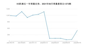 2022年7月,K5凯酷销量为508辆,同比下降57.31%,环比增长512.05%。2021年07月-2022年07月份,K5凯酷销量为9723辆,同比下降52.08%。