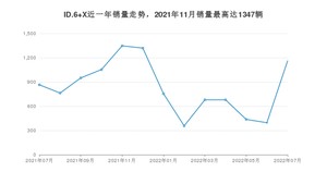 2022年7月,ID.6 X销量为1161辆,同比增长34.22%,环比增长193.18%。2021年07月-2022年07月份,ID.6 X销量为10761辆,同比增长728.41%。