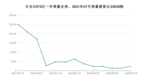2022年7月,长安CS75销量为2410辆,同比下降90.37%,环比增长76.82%。2021年07月-2022年07月份,长安CS75销量为94856辆,同比下降72.76%。