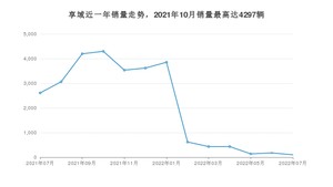 2022年7月,享域销量为100辆,同比下降96.17%,环比下降43.5%。2021年07月-2022年07月份,享域销量为27074辆,同比下降35.66%。