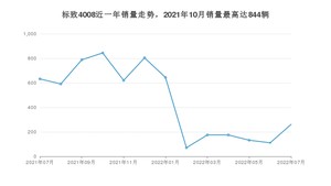 2022年7月,标致4008销量为261辆,同比下降58.7%,环比增长135.14%。2021年07月-2022年07月份,标致4008销量为5848辆,同比下降28.88%。