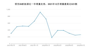 2022年7月,领克06新能源销量为265辆,同比下降11.96%,环比增长6.43%。2021年07月-2022年07月份,领克06新能源销量为5900辆,同比增长132.1%。