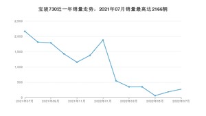 2022年7月,宝骏730销量为274辆,同比下降87.35%,环比增长48.11%。2021年07月-2022年07月份,宝骏730销量为13377辆,同比下降73.46%。