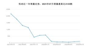 2022年7月,悦纳销量为119辆,同比下降94.48%,环比增长23.96%。2021年07月-2022年07月份,悦纳销量为8481辆,同比下降67.26%。