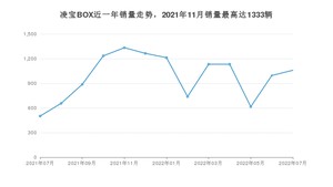 2022年7月,凌宝BOX销量为1059辆,同比增长111.38%,环比增长6.43%。2021年07月-2022年07月份,凌宝BOX销量为12758辆,同比增长389.19%。