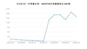 2022年7月,风光E1销量为1581辆,同比增长1%,环比下降16.39%。2021年07月-2022年07月份,风光E1销量为10199辆,同比增长632.16%。