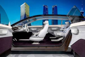 既然是豪华品牌,那就要有更多的仪式感。当你靠近Concept Recharge时,车前的logo会亮,当你坐进车内,独有的悬浮式星空木饰板、水晶音乐氛围灯都会随之点亮。纯电平台让车辆的地板可以实现纯平。所以,车内的空间被打造的更像一个客厅,而且前后排座椅采取阶梯式布局,一键操作即可升降后排。后车窗在玻璃完全升起后,可以变成一个投影屏幕,用来展现车窗外盲区的景色及地理位置。