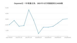 2022年8月,Cayenne销量为3075辆,同比增长52.3%,环比增长3.47%。2021年08月-2022年08月份,Cayenne销量为29581辆,同比下降15.64%。
