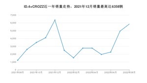 2022年8月,ID.4 CROZZ销量为5852辆,同比增长376.94%,环比增长18.39%。2021年08月-2022年08月份,ID.4 CROZZ销量为42396辆,同比增长673.37%。