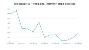 2022年8月,奔驰C级(进口)销量为189辆,同比下降68.6%,环比增长112.36%。2021年08月-2022年08月份,奔驰C级(进口)销量为3228辆,同比下降67.27%。