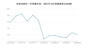 2022年8月,标致4008销量为208辆,同比下降64.81%,环比下降20.31%。2021年08月-2022年08月份,标致4008销量为5424辆,同比下降33.14%。