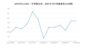 2022年8月,ARCFOX αS销量为438辆,同比增长129.32%,环比下降0.68%。2021年08月-2022年08月份,ARCFOX αS销量为4386辆,同比增长691.7%。
