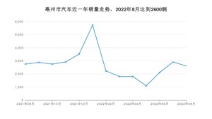 2022年8月,亳州市汽车总销量为2600辆,同比下降5.59%,环比下降10.71%。2021年08月-2022年08月份,亳州市总销量为35102辆,同比下降13.3%。在最近1年中,亳州市销量在2022年01月达到最高,销量为5733辆。