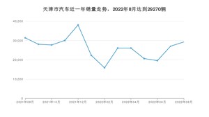 2022年8月,天津市汽车总销量为29270辆,同比下降6.82%,环比增长8.07%。2021年08月-2022年08月份,天津市总销量为342366辆,同比下降17.46%。在最近1年中,天津市销量在2021年12月达到最高,销量为38096辆。