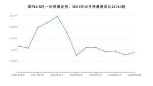 2022年8月,秦PLUS销量为8812辆,同比下降23.72%,环比增长14.49%。2021年08月-2022年08月份,秦PLUS销量为170650辆,同比增长252.29%。